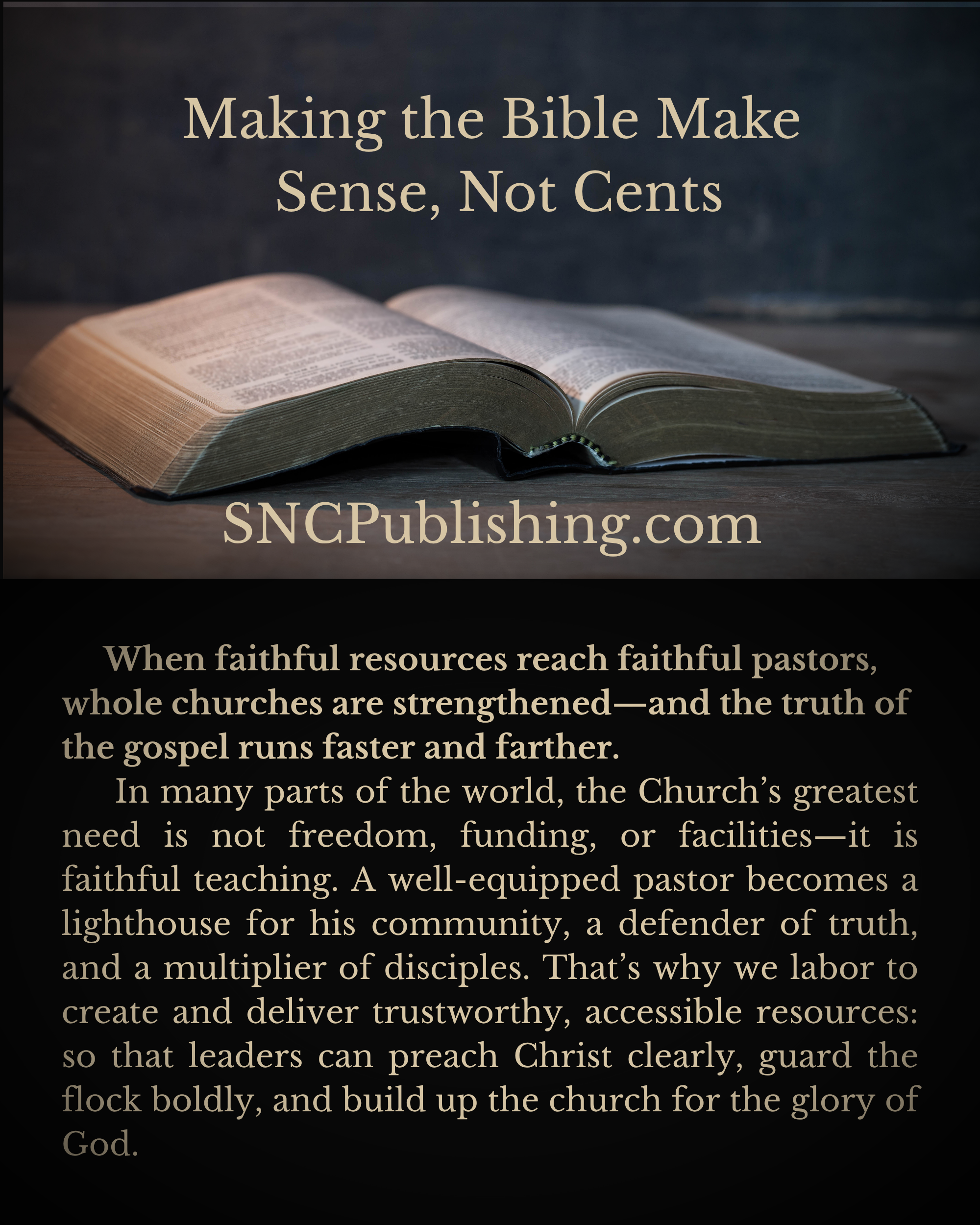 Founded with a burden for doctrinal clarity and global discipleship, SNC Publishing partners with churches, pastors, and ministries around the world to produce resources that are clear, convicting, and Christ-exalting.
